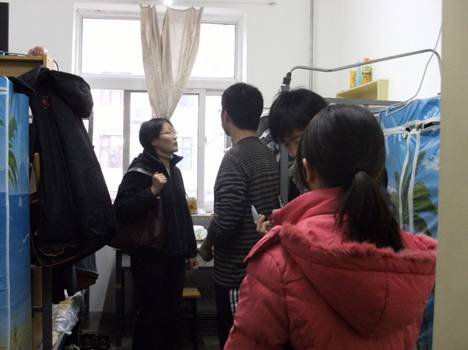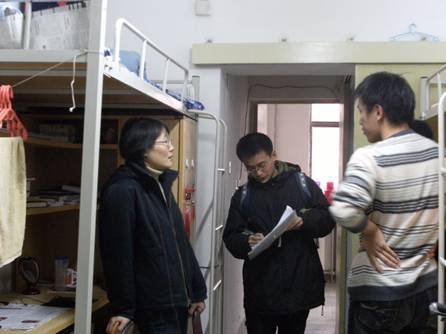 方老师和杨老师在学生会主席许辰加、研究生会主席董习及院团委宣传部部长的陪同下首先来到了品园二楼,该楼住着beat36509级本科班的男生。刚进寝室,老师们就觉得眼前一亮,只见寝室里东西摆放得井井有条,被子也是方方正正的,方老师还特别夸奖了寝室一排排整齐干净的鞋子,表扬大一的孩子能干,给了他们极大的鼓舞和信心。老师们和同学之间的距离也在无形中拉近了许多。