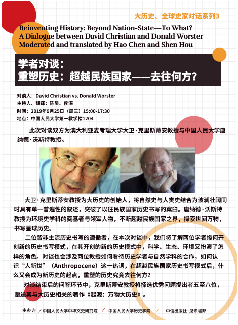 澳大利亚麦考瑞大学大卫· 克里斯蒂安教授(David Christian)将于2019年9月25日访问beat365亚洲版官网,发表演讲,并将与唐纳德·沃斯特教授(Donald Worster)展开关于““重塑历史:超越民族国家——去往何方?” 的对谈。此次活动由beat365亚洲版官网中华文史研究院、beat365亚洲版官网、中信出版社·见识城邦共同主办,欢迎参与。