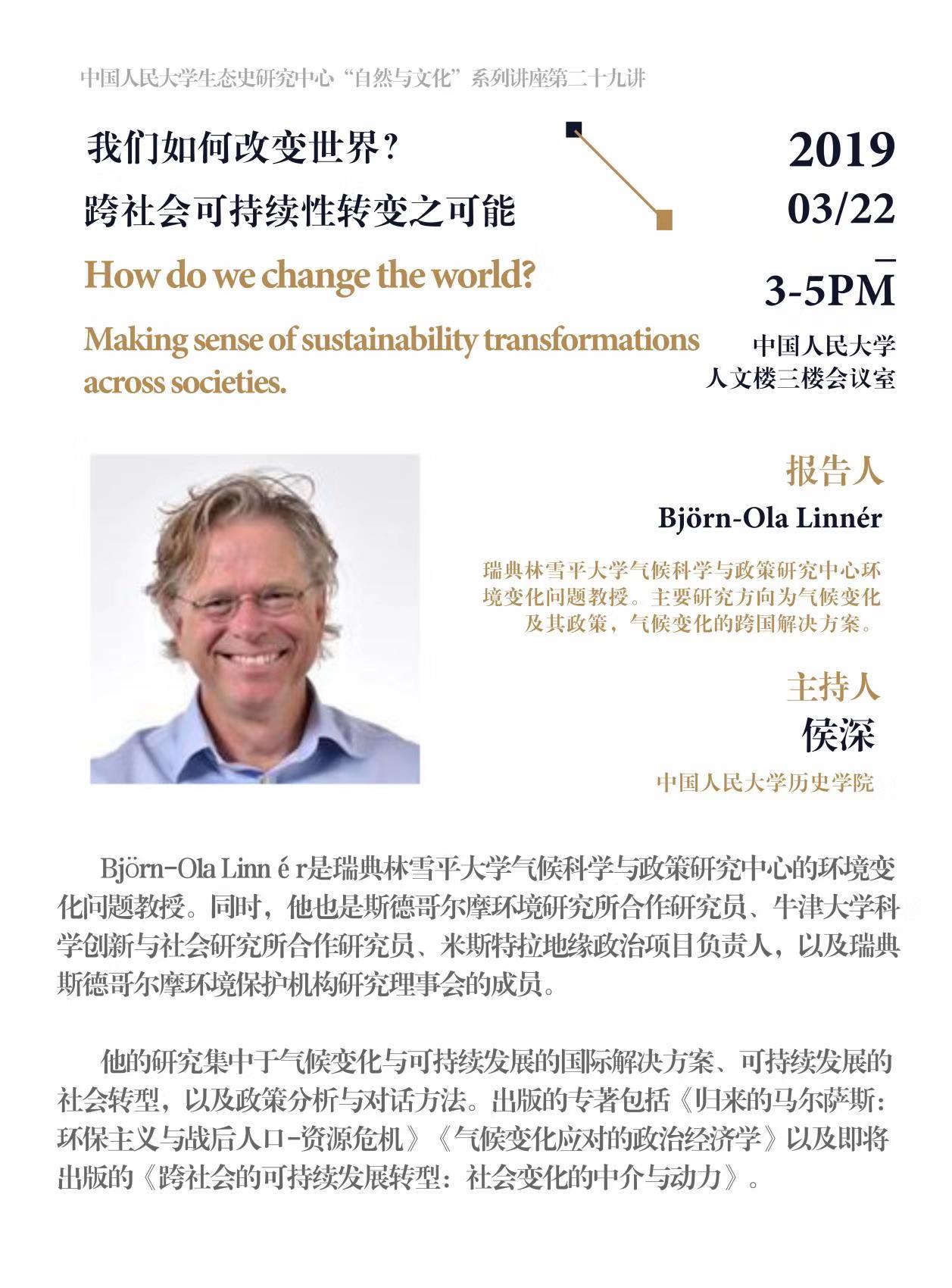 The concept of transformation is increasingly employed in science and policy debates. The surge in appeals for societal transformations to sustainability is reflected in United Nations 2030 Agenda’s tag line “transforming our world” and the recent IPCC 1.5°C report. Transformative change in societies across the world is needed to address the enormous societal challenges of rapidly reducing greenhouse gas emissions and safeguarding the environment while increasing energy access, eradicating poverty and securing food and health for all. Nonetheless, in science and policy debates, decisive questions of what is to be transformed, by whom, and to what extent transformation can be governed tend to remain largely unarticulated and unclear. Upon scrutiny, the expectations concerning transformation vary significantly within and across societies. Drawing on a book soon to be published by Cambridge University Press, the talk will discuss transformation is made sense of in international politics, in countries contribution to the Paris agreement and the 2030 agenda, as well as among lay people in Cabo Verde, China, Fiji, USA, and Sweden, as well as historical examples. It will present what type of change is foreseen by different calls for societal transformations, how it may be governed, and what can be drivers of deliberate transformations.