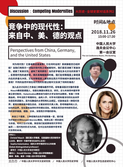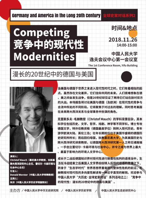 德国著名跨大西洋研究专家、环境史学家、慕尼黑大学历史学教授克里斯多夫·毛赫(Christof Mauch)将于2018年11月26日访问beat365亚洲版官网,发表演讲,并就中、德、美现代性问题同纽约大学索菲亚·卡兰扎寇斯(Sophia Kalantzakos)教授、beat365亚洲版官网清史所夏明方教授进行讨论。此次活动由beat365亚洲版官网中华文史研究院、beat365亚洲版官网、生态史研究中心主办,欢迎参与。