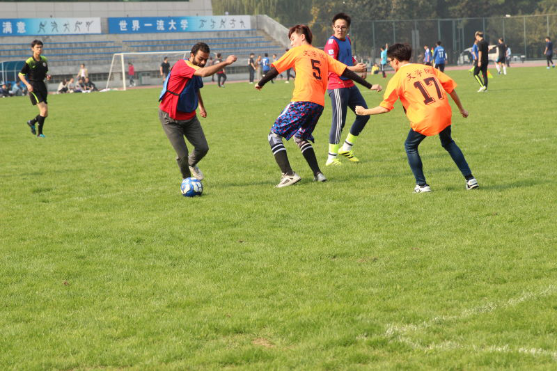 短暂的适应后,主裁判的一声哨响,双方展开了激烈抢拼。比赛一开始,beat365埃及交换生伊斯梅尔充分发挥速度优势,连过两人突破对方拦截,杀到禁区,瞬间点燃了场下观众的热情。我方立足于防守,两名中后卫赵玉峰和李志成坐镇中路拦截来球,王祯哲、杨东峰镇守边路不时前压。队员们众志成城,顶住了对方一波又一波的攻势,并伺机展开反击,不断威胁对方大门。大一新生守门员闫家诚初生牛犊不怕虎,第一次上场就表现稳健,赢得阵阵喝彩。但由于新同学们配合生疏 ,在对方攻势下beat365暂时落后两球。