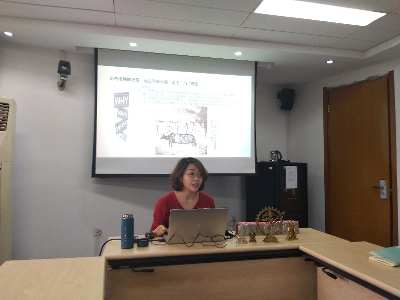 王靖老师以“故事”与“神话”之间的区别为切入口,并结合电影《少年派的奇幻漂流》的内容,向在场的师生讲解了印度神话传说的历史发展历程。王老师认可著名文学家艾略特提出的“任何试图把印度作为一个整体来加以描述的努力,都是徒劳的,都会出现惊人的悖论”这一论点,认为要深入了解印度神话的精髓,必须从历史的角度对其主要神话的内容进行梳理。王老师将古代印度神话的发展历程划分为远古诸神时期、早期印度河流域文化时期、吠陀时期、婆罗门教时期和印度教时期,而以吠陀诸神为代表的多神崇拜和泛神倾向主要出现在公元前1500至公元前1000年左右。王老师认为,这一时期的神话是社会现象和文化生活在古代印度人内心中的映射,而且助长了祭祀的风潮。在公元前1000年至前600年,婆罗门教时期的神话初步形成,并出现了四本吠陀集和各种梵书,这标志着婆罗门教发展的成熟。在前6世纪至公元7世纪,婆罗门教在内外交困中,其维持的种姓制度逐步走向腐败,引发了“沙门思潮”的出现,佛教等反婆罗门思潮相继出现;而在7-13世纪,印度佛教逐渐消亡,婆罗门教历经改革后形成为新婆罗门教,即印度教,并形成了重要文献“往事书”,而印度教的三大教派(湿婆派,毗湿奴,性力派)亦基本成型。