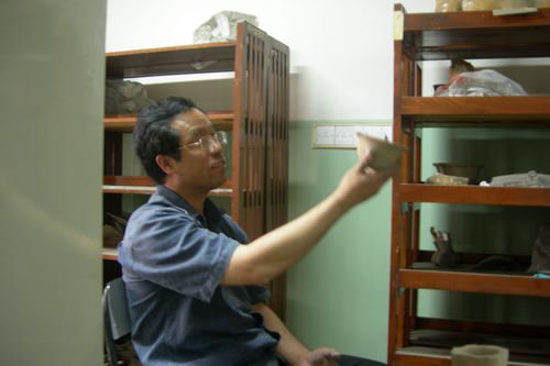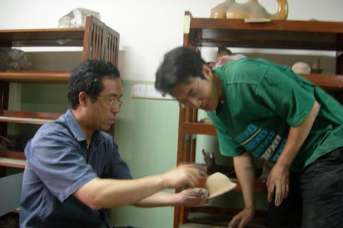 高峰与杨鹏同学(杨鹏同学所持汉代陶烛台已被鉴定为珍品)