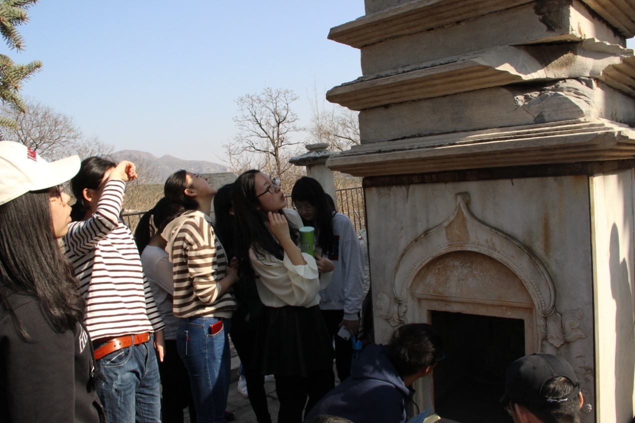 云居寺的佛塔也堪称一绝,尤其是北塔始建于隋唐时期,塔身是辽代所见,四角为唐代小石塔。邱靖嘉老师在现场进行了现场教学,为同学们详细介绍了这座佛塔的规制与历史价值。他说,云居寺北塔建于八角须弥座之上,塔身集楼阁式、覆钵式和金刚宝座为一体,造型极为特殊。北塔周身雕琢亦极致精美,如其底座有佛偈语砖176块,上以砖石砌成斗拱,塑力士像负之,上置覆钵和“十三天”塔刹。北塔四面还有唐、辽、明各代建造的砖、石塔十余座,并有大小碑刻无数。从艺术角度和史料角度,都是不可多见的珍品。邱老师还结合同学们的课堂所学指出,碑刻等文字史料在历史文献学中具有重要的地位,希望同学们在欣赏云居寺“三绝”及各处碑刻的时候,能够想起课堂上所学的知识,从而对历史学能有更加深刻的感悟。