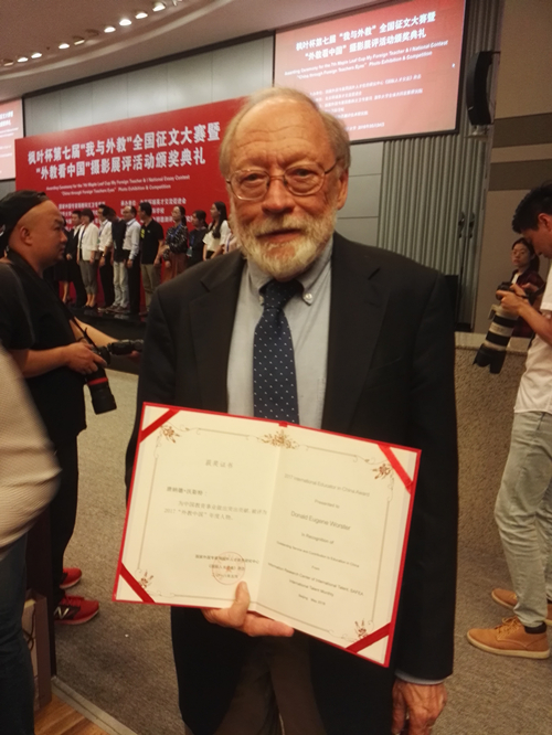 2018年5月24日上午,由国家外国专家局等单位联合举办的枫叶杯·第七届“我与外教”全国大赛颁奖典礼暨第六届“国际人才之路”论坛在清华大学隆重举行。会上,经过严格的评选而产生出的来自全国各高等院校的十位外国专家获颁2017“外教中国”年度人物,其中包括美国著名历史学家唐纳德·沃斯特(Donald Eugene Worster)教授。学校人事处的韩东晖处长和人才办邢鹏老师参加了颁奖典礼,代表学校对沃斯特教授对我校历史学科做出的贡献表示感谢,对此次获奖表示祝贺。beat365历史系主任王大庆老师和杜宣莹老师陪同参会。
